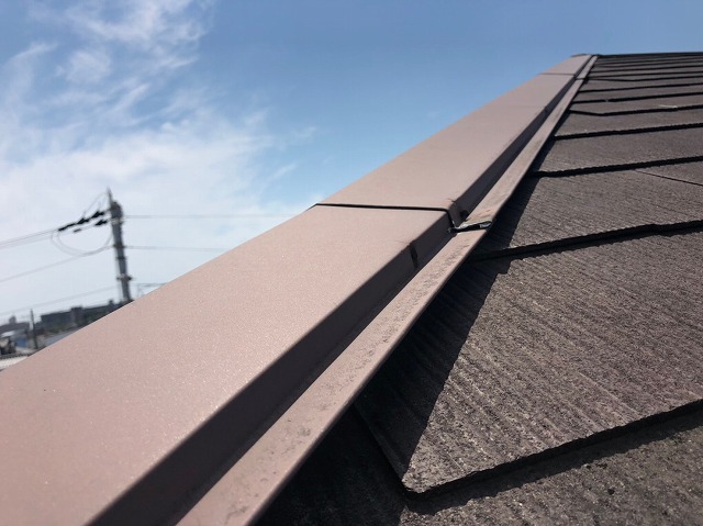棟板金は屋根材と屋根材の取り合いを覆っている箇所となり、取り合い箇所から雨水が入らないようにしてくれています。