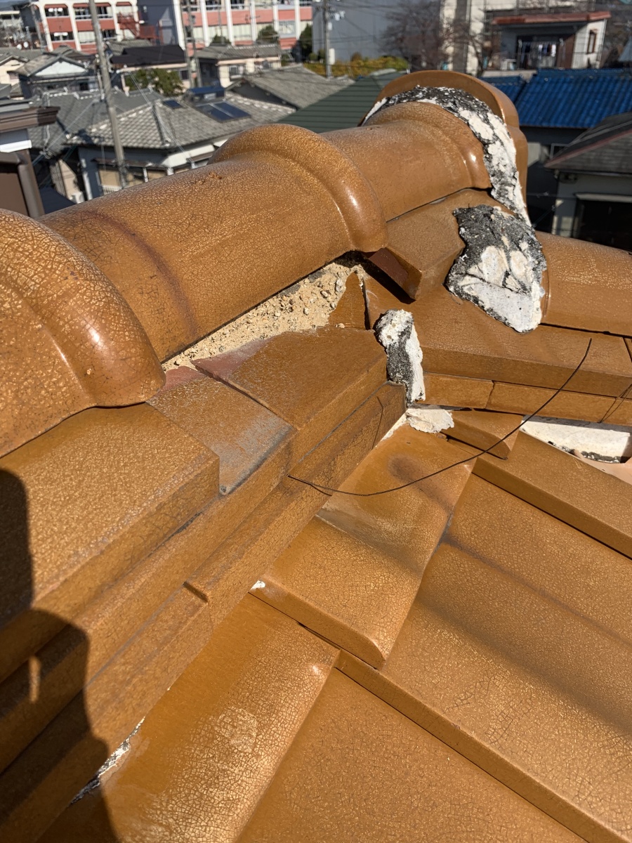 棟部分は瓦を積み上げている葺き土が盛ってあるので、瓦がズレたり、無くなってしまうと雨水を吸い込んで、さらに棟がズレたり雨漏れの原因になってしまいます。