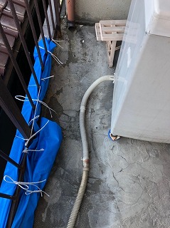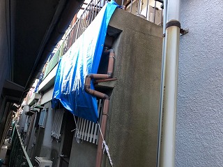 工事までの間、ベランダ底部にブルーシートを張り、雨水の侵入を防ぐ応急処置を行いました。落下した廃材は全て撤去し、安全を確保。「これで少し安心しました」と奥様。ですが、根本解決には早急な修繕が必要です。