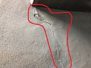 ベランダ下の外壁にもひび割れや剥がれが発生。傾きによる荷重の偏りが原因です。
