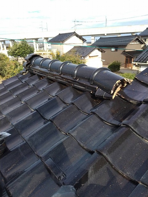 野々市市にて瓦が飛散、アンテナが転倒してるお家がありましたのでお伺いしたところ工事のお願いを受けました。