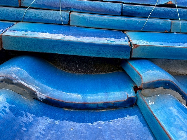 棟瓦の一部はご覧のように、本来漆喰が補填されている箇所が空洞になっている場所も見受けられました。漆喰は棟瓦内部の土が外に流れ出ないよう、蓋のような役割を果たしています。今回のように剥離してしまうと、土が流れ出し棟瓦の固定力が弱くなった結果、雨漏り被害を引き起こすズレ・歪みが生じる恐れがあるため注意しましょう。