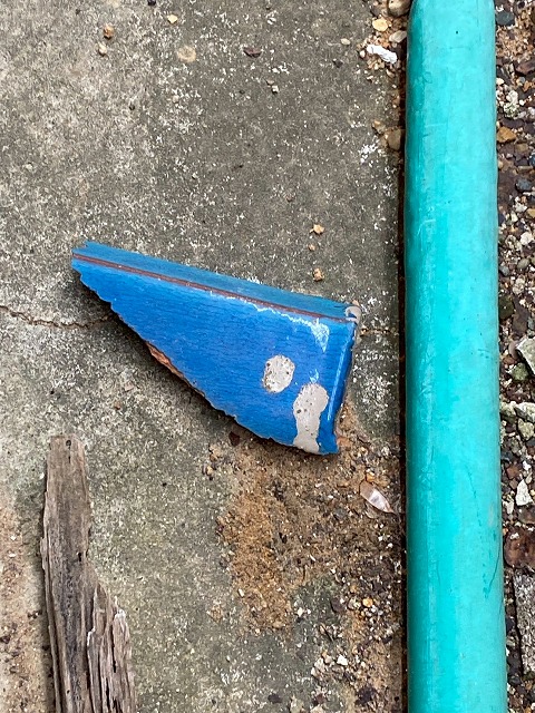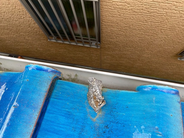 現地調査を進めていくと、ご覧のように剥離した漆喰の破片も見つかりました。漆喰の剥離は棟瓦の不具合へと発展する恐れがあるだけでなく、雨樋に落ちて排水不良を引き起こす恐れもあります。排水不良が生じた雨樋は大雨でオーバーフローを引き起こし、雨漏り被害へと発展する可能性も想定されるので定期的な清掃がおすすめです。