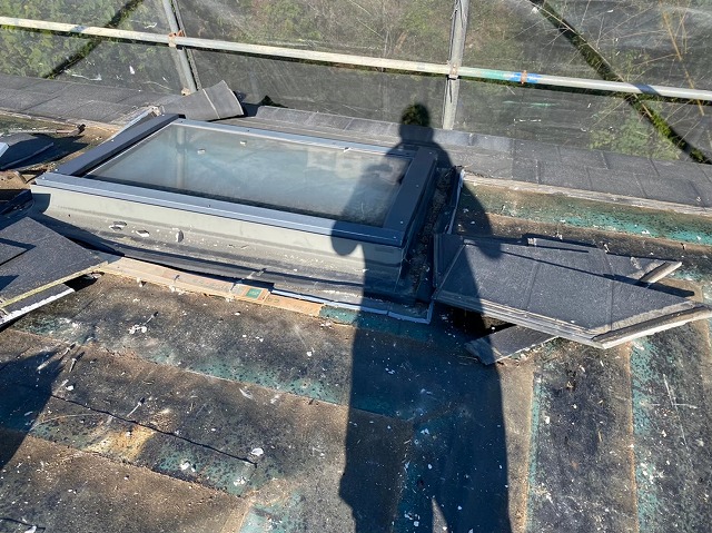 生駒市で葺き替え工事で棟板金や屋根材を撤去、屋根の解体作業開始