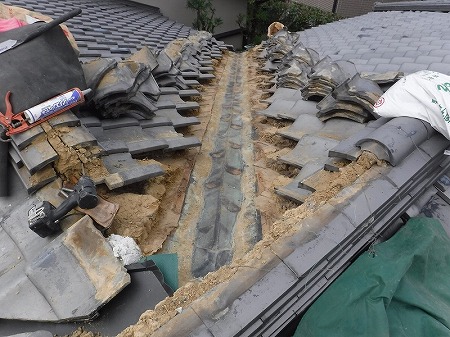 修理にあたり、まずは新しい谷板金を差し込むためのスペースを作る必要があります。 谷板金は瓦の下に潜り込んでいるため、そのままでは交換できません。