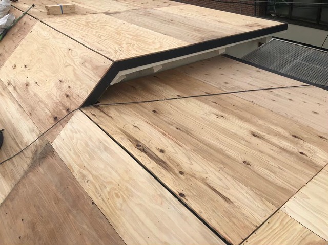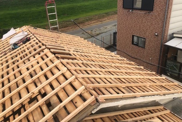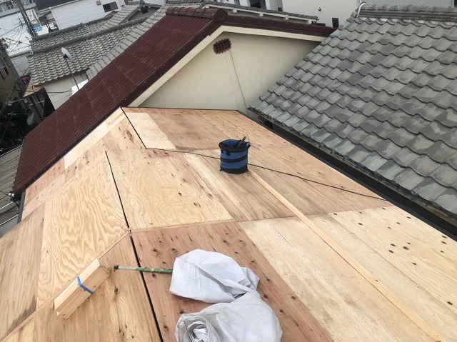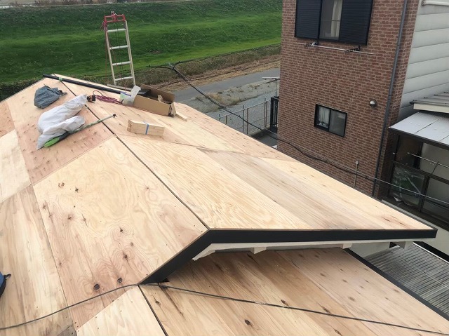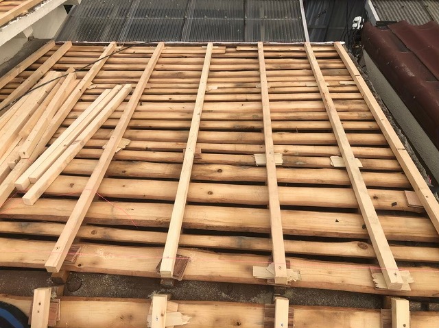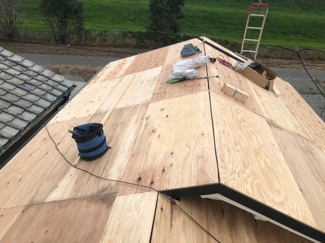 点検の結果このままでは危険と判断し、葺き替え工事をご提案し、ご了承いただきました。 葺き替え工事の流れで、古い下地であるバラ板に構造用合板を増し張りしていきます。