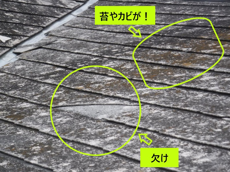 また、屋根一面に苔やカビが生え、かなり劣化が進んでいました。