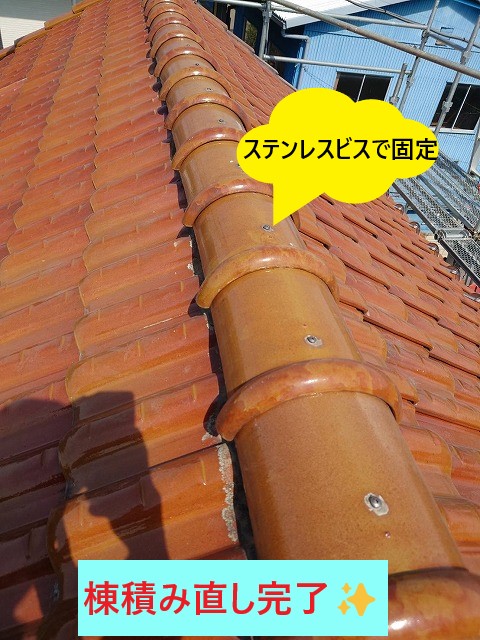 棟瓦を積み直し、ステンレスビスで固定したら、棟積み直し工事の完成です✨