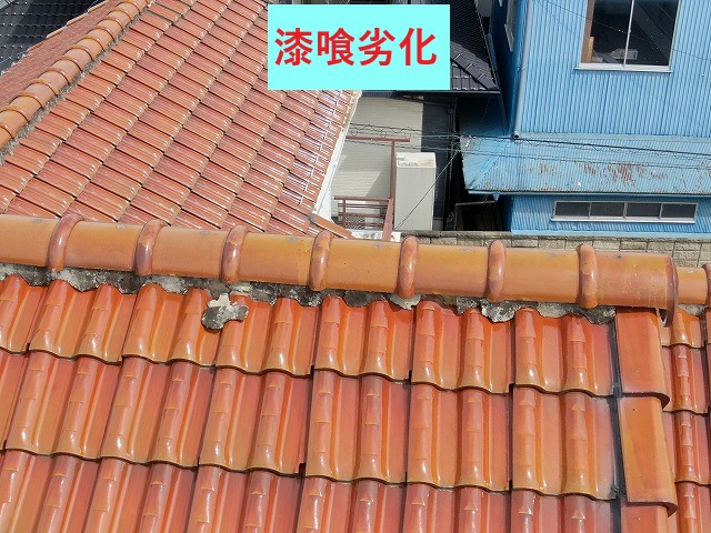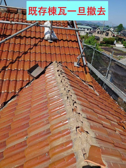 棟瓦を一旦撤去し、漆喰も同時に撤去。新たに漆喰を詰め直し、撤去した棟瓦を再び設置する瓦工事です!