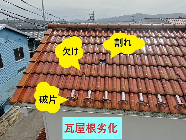 割れ・欠けは屋根全体に広がり、再利用できない瓦は新規に用意する必要があります。