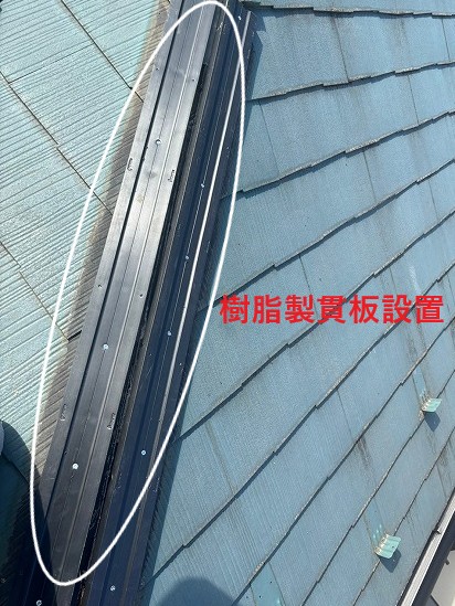 棟板金を固定するための下地となる貫板には、従来の木材ではなく、耐久性の高い樹脂製貫板を採用しました。樹脂製貫板は腐食に強く、長期にわたって棟板金をしっかりと支えます。