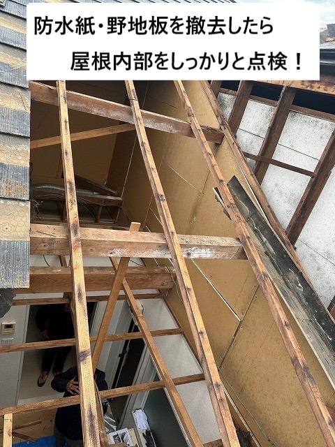 古い屋根材を取り除いたあとは、屋根の中身が丸見えに。ふだん見えない部分だからこそ、傷んでいないかどうかしっかり確認します。必要があれば補修してから新しい屋根をつけていくので安心です。