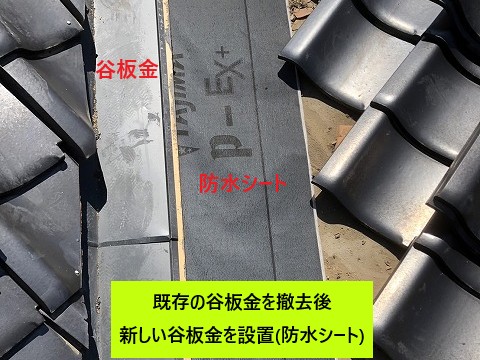まずは谷部分の瓦を一時的に外し、劣化した谷板金を撤去します。