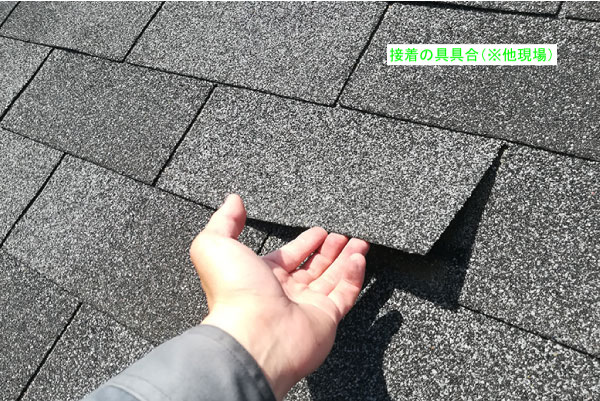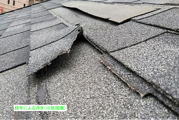 アスファルトシングルの主な不具合は、「経年による浮き」と「接着の不具合」です。