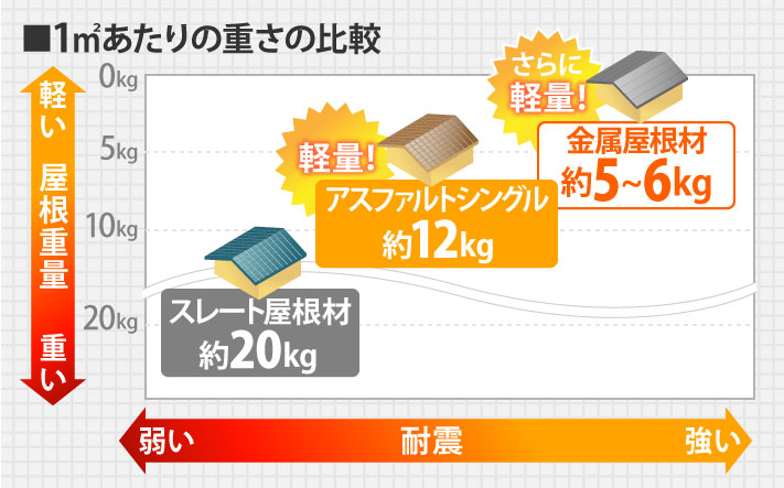 重さの比較では、ガルバリウムなどの金属屋根材とスレートの中間に位置しています。