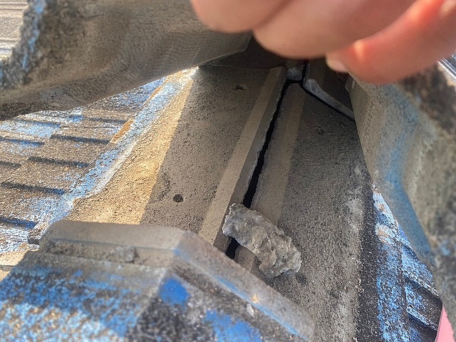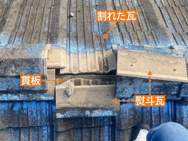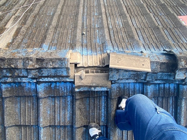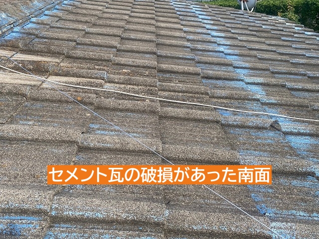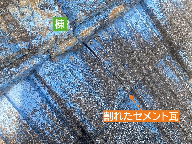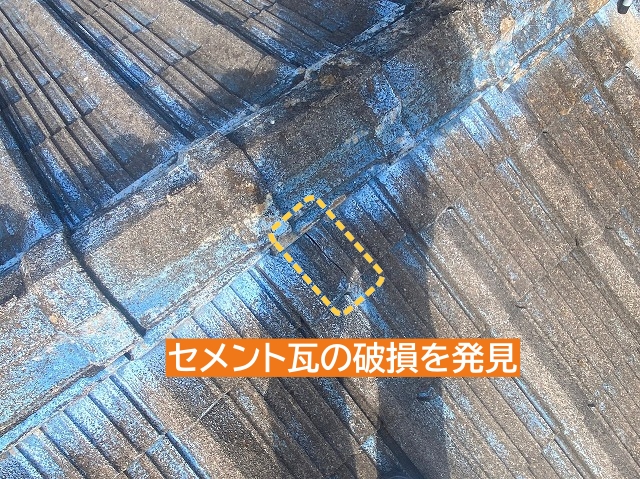 セメント瓦屋根に登って状態を確認したところ、棟際に破損箇所を見つけました。