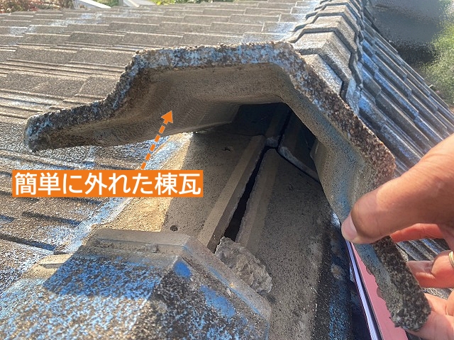 釘で留め付けられているわけでもないので、割れたセメント瓦のすぐ上の棟瓦を持ち上げてみたところ、案の定簡単に外れてしまいました。