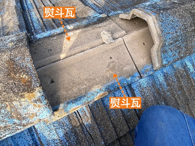 熨斗瓦は釘留めされていますが、破損したセメント瓦の上の熨斗瓦は釘が抜けてしまい、こちらも簡単に取り外すことができました。