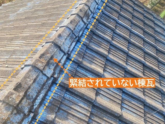 通常は棟瓦の下に段積みされる熨斗瓦と、銅線や鉄線などで緊結して固定しますが、こちらの住宅の棟には緊結線が見当たりません( ˙ㅿ˙ ;)