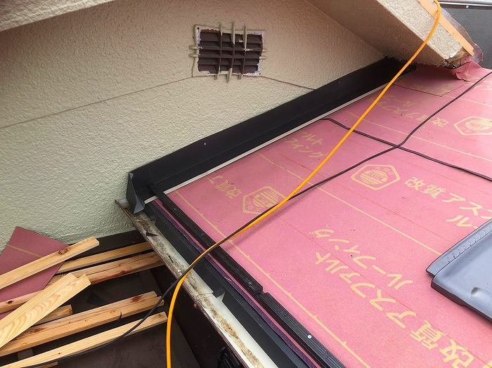 それぞれの材質の取り合いなどは雨水が浸入しやすい箇所なので下地の捨て板金を設置して、雨水の浸入を防ぎます。