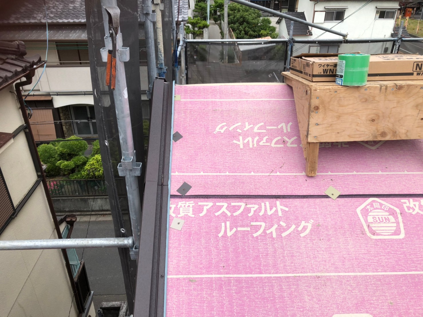 屋根の下地は不陸もなくまだ利用できそうでした。既存屋根のカラーベストの上から新しい防水シートを被せていきます。被せていくときは軒先から順に重ねながら、頂上の棟まで張っていきます。