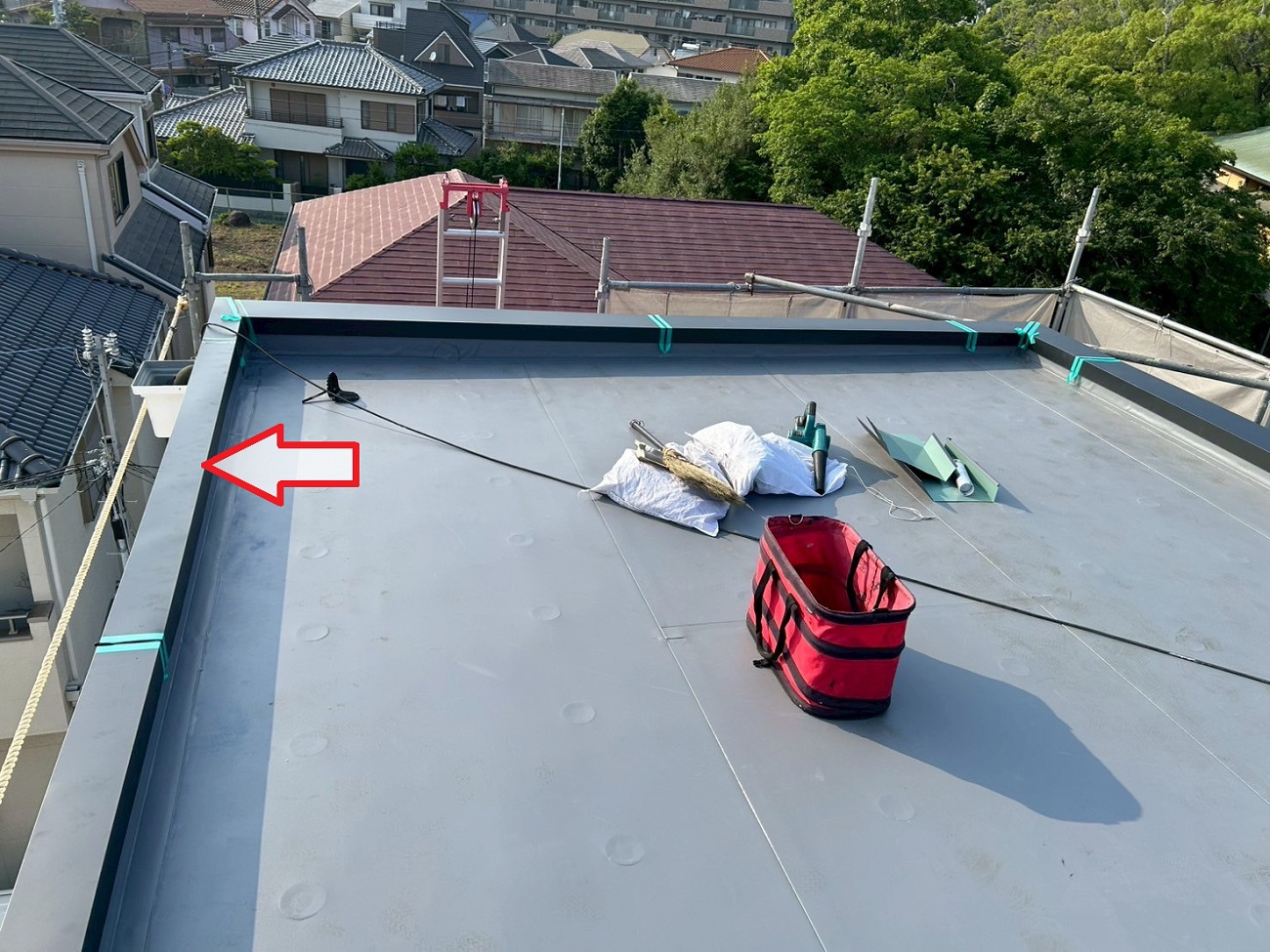 神戸市長田区で陸屋根のパラペット上にガルバリウム鋼板製の笠木を設置しました(^^)/風雨や紫外線で劣化が進み雨水浸入の危険があったため、軽量で耐久性の高い材料を採用し保護。内部木部の腐食や雨漏り防止のため早めの対策として実施し、屋上防水工事も同時に行いましたよ。