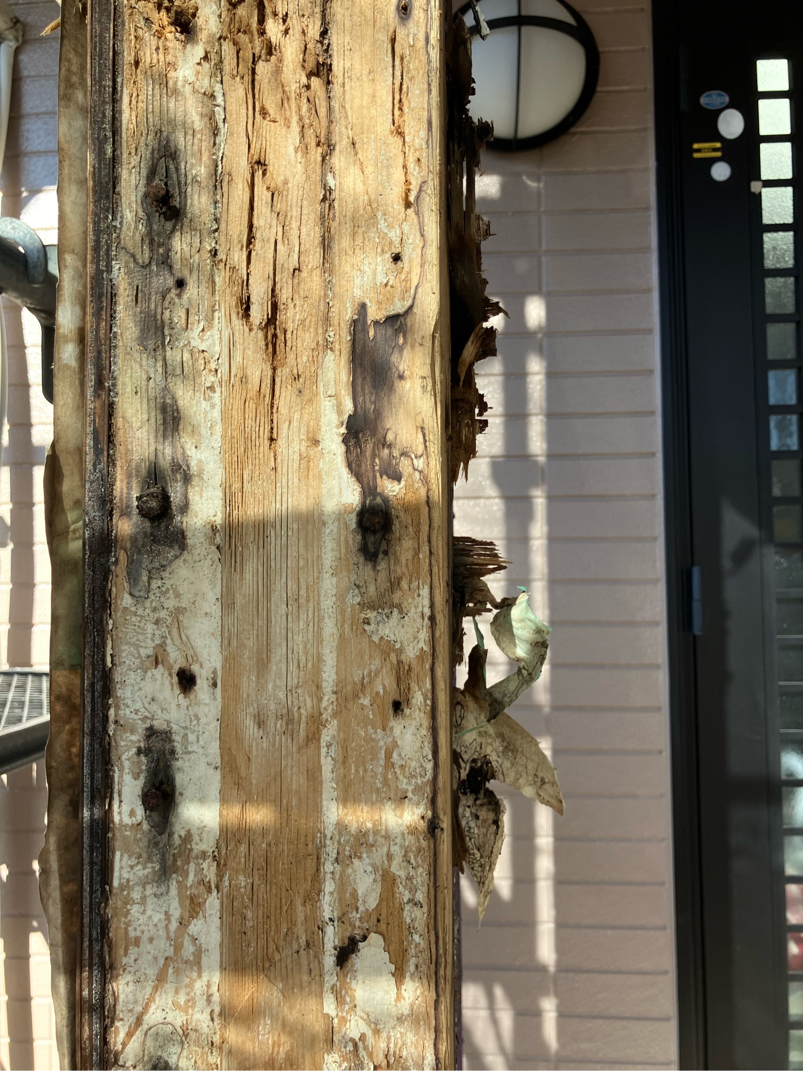 かすみがうら市で雨漏り被害で腐食した木部を解体・補修、新築時の施工不良により玄関柱の内部がボロボロに…