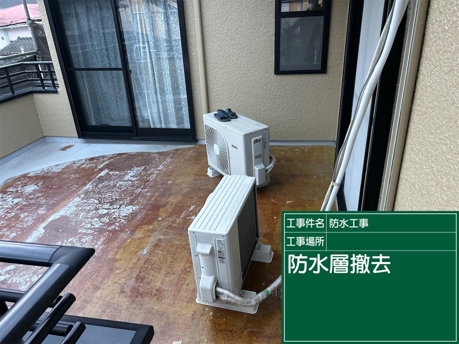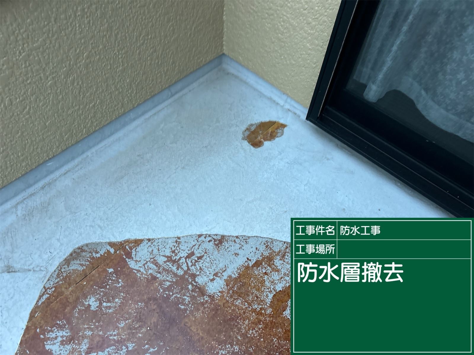 FRP防水を全面的に撤去したところです。床自体には大きな劣化は見られませんでした。防水が破れる前に早めの相談をしていただいたのが幸いしたと言えるでしょう。