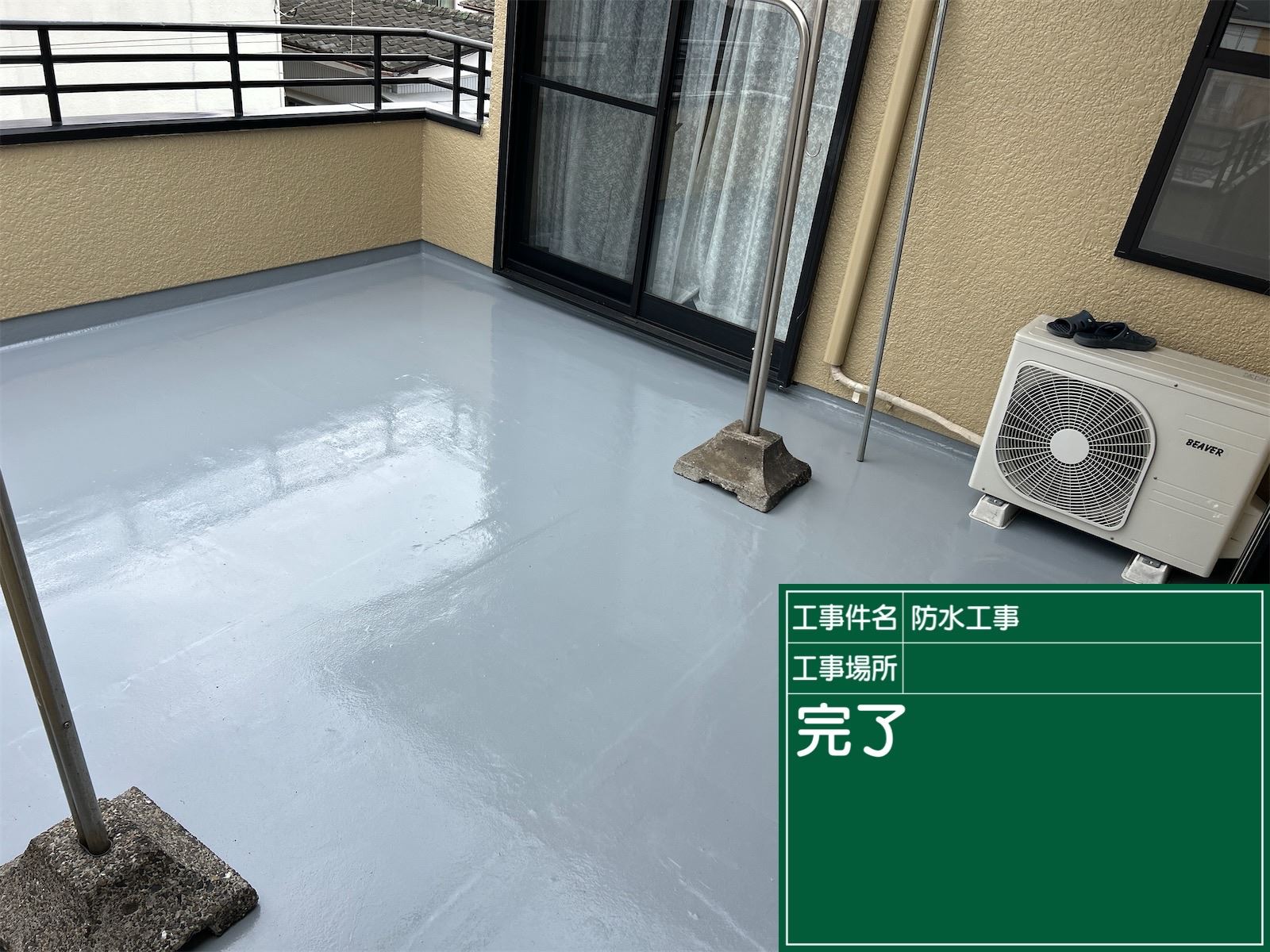 浮き上がっていたFRP防水をすべて撤去して、ベランダ全体のFRP防水をやり直しました。早期にFRP防水が浮き上がってくるのは、下地処理の問題が原因と考えられます。今回は同じトラブルを繰り返さないように、既存のFRPを残さず撤去し、しっかりとした下地処理を心がけました。これでしばらくは問題ないでしょう。