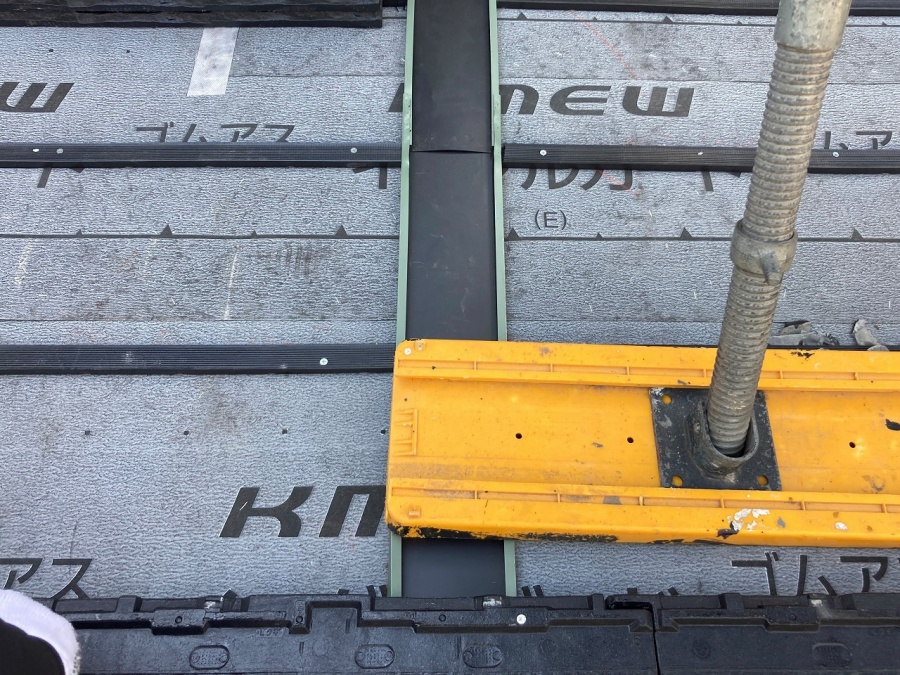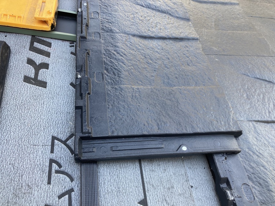 屋根材施工前には瓦と同様に流れ方向の長さで割付を行いますが、流れ方向の働き寸法は250mm~300mmとなってなすので、その範囲で割付ます。瓦ですと働き寸法が決まってますからね。様々な屋根寸法に対応できます。桟木腐食に強い樹脂製を使用しています。ケイミュー社の純正部材です。当社ではすべて純正の部材を使用しています。やはり信用と安心感があります。