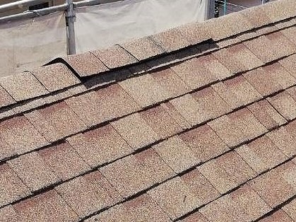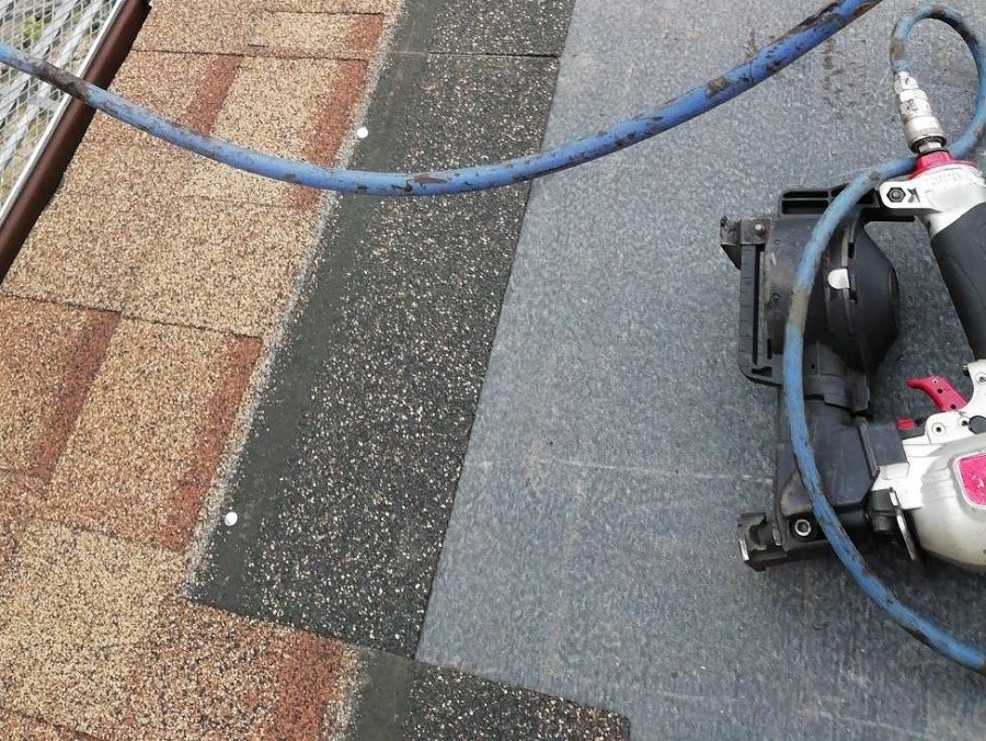 瀬戸内市で築30年になるカラーベスト屋根の改修工事です。今回はカラーベストを撤去しなくても施工可能なアスファルトシングルのカバー工事です。既存のカラーベストは30年前のカラーベストですので有害なアスベストを含んでいます。撤去して葺き替えとなると、撤去費用、撤去工事時の養生も大変です。工事費用を抑える事もできるアスファルトシングルはカバー工事に最適な部材です。ルーフィングの貼り付けが完了し、屋根材を葺き始めました。