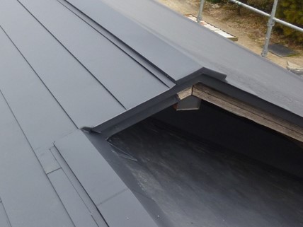 谷部、壁取り合い部分の状況です。同色と言う事もあり、スッキリとした仕上がりです。この部分もよく雨漏り発生箇所になる部分ですので、チェックが必要です。以前の状態も谷板金は腐食によって、穴が開いていました。異物、ゴミにより水の流れを塞いでいるお宅もあります。そうなると板金部分を超えた水が屋根地に伝わる事となります。危険ですので、自分では出来ませんが、定期的に屋根の点検も行いたいですね。その時は当社に依頼してください。登れない屋根にはドローンを使用して点検させていただきます。