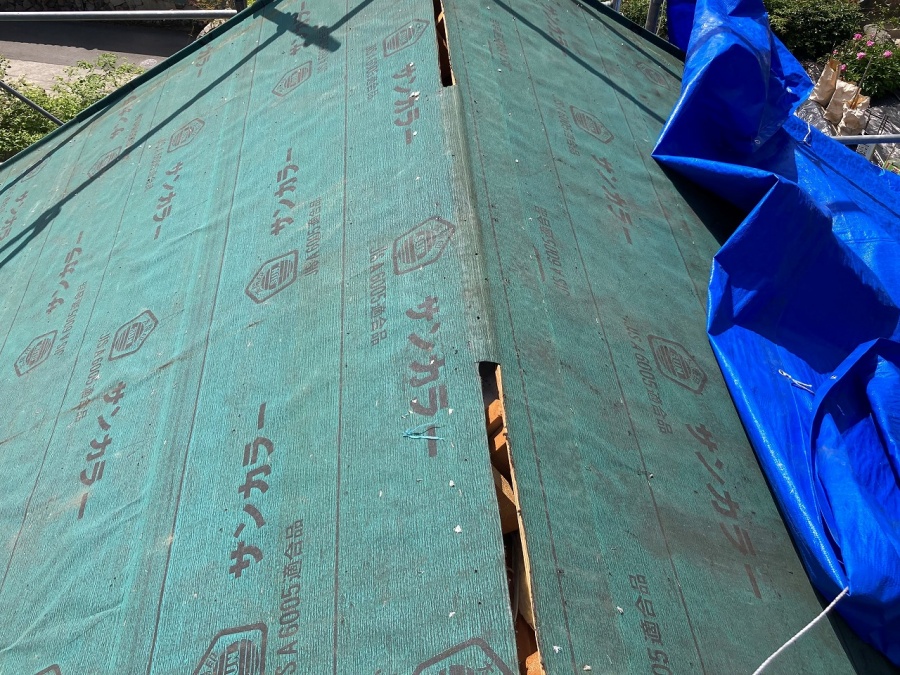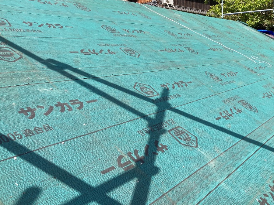 アストロフォイル、瓦桟を撤去し、既存の下葺き材の状態です。清掃して新しい下葺き材を張っていきます。下地の状態は問題ないみたいですね。