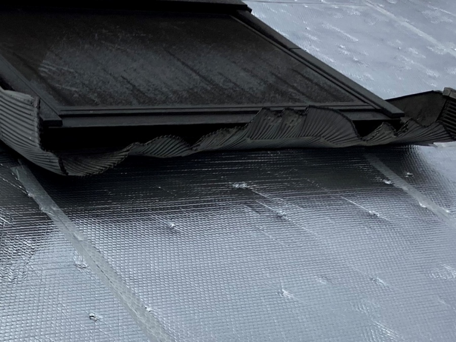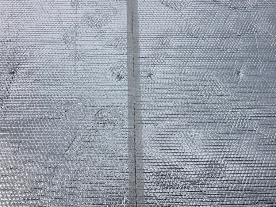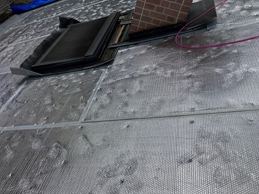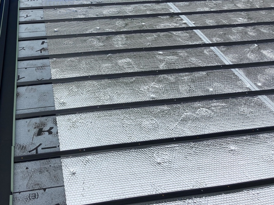 倉敷市大島で、瓦葺き替え工事中、断熱材「アストロフォイル」敷き完了です