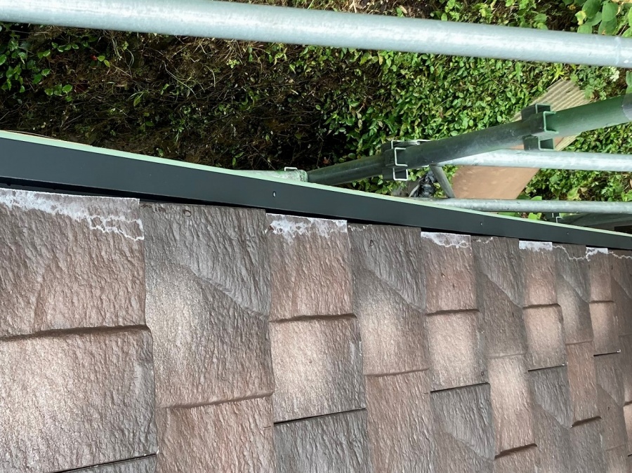 ケラバ段違い部です。こちらは役物取付前に板金水切りを取付ます。奥には捨て谷が入っていますので、奥まで水が浸入しても軒先に排水されます。正しい施工が要求される部分です。