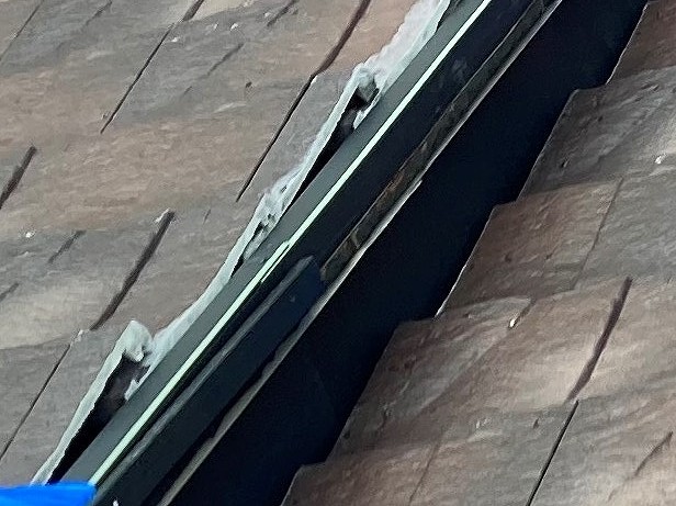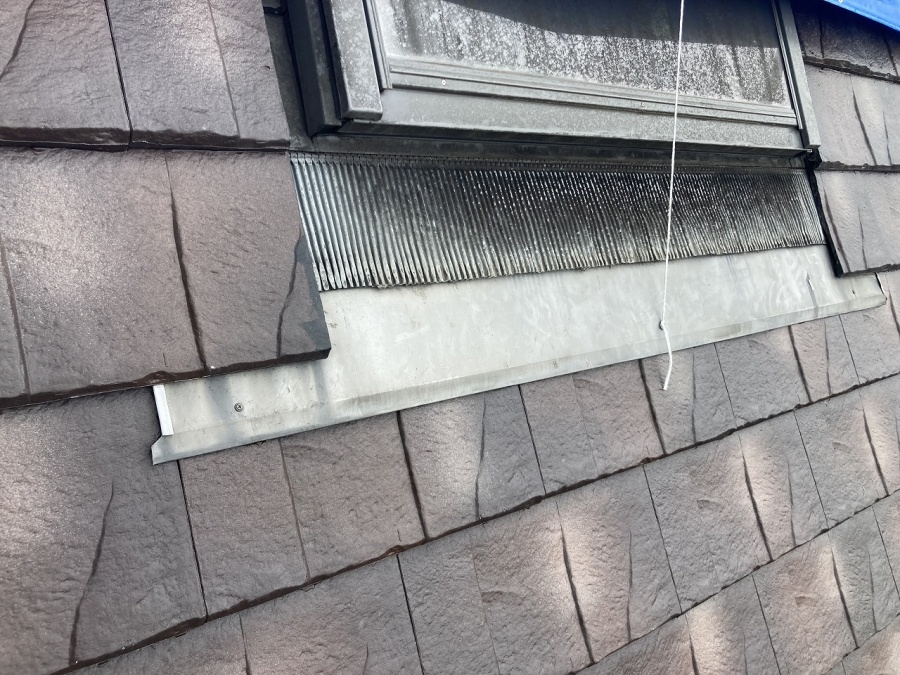 トップライト周辺です。トップライトは既存の物です。平板形状の瓦~「ルーガ」ですので、製品の形状、仕上がり高さが同程度ですので、そのまま使用できますが、水切り、下端の鉛シートの損傷等の確認は必要です。こちらの地域では、山が近い事で、改修前にはかなりの落ち葉が水切りに詰まっていました。当然傷の流れを遮りますので、最悪、雨漏りを起こします。これと言った対策はないのでしょうが、定期的な点検清掃はしたほうがいいでしょう。