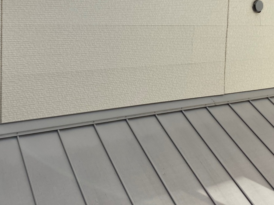 外壁取り合い部です。同色の雨押え板金でシンプルに収まっています。ガルバリウム鋼板ですので、様々な色から選択できます。こちらのお宅ではシルバ色を使用しています。熱伝導率の高い金属素材ですので、瓦等と比較して、熱を伝えやすいと言うデメリットもありますが、サーモバリアなどの断熱材で解消することも可能です。