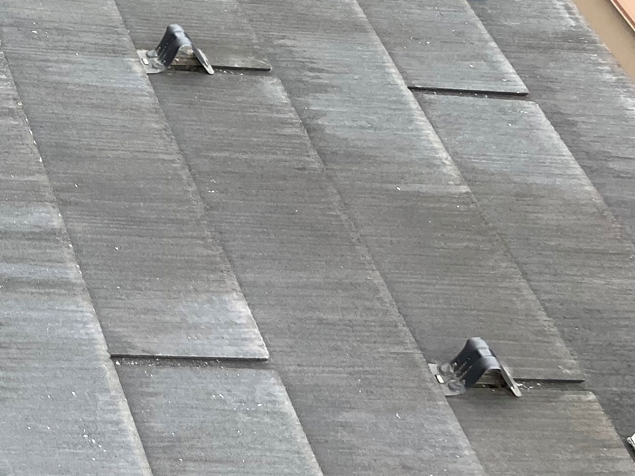 温暖な岡山市内ですが、こちらは北部と言う事もあり、冬季には雪が降る事もあります。雪の落下を防ぐ、雪止め金物を付けていました。カラーベストの施工時にビスで屋根地に固定をするのですが、金物周囲には金物の厚み分の隙間が生じます。その部分を強く踏むとカラーベストに負担がかかり、クラックが発生することがあります。金物周辺は極力歩行しない様にしたいですね。