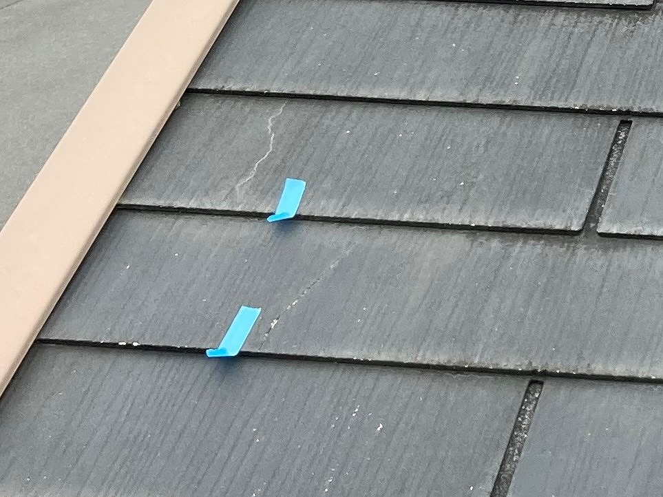 こちらの屋根形状は南北2面の片流れ屋根です。屋根勾配は2.5寸勾配と緩やかな勾配です。遠くから見ると特に異常は見えないのですが、近い部分で点検すると、クラック部分があることが分かります。