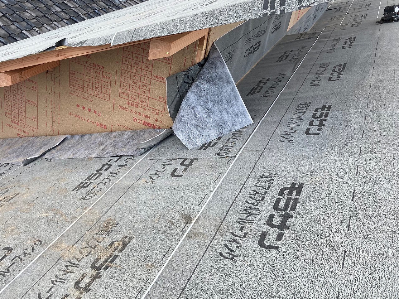 ホーム > 倉敷市中庄で増築部板金屋根葺き、下葺き材貼り中です