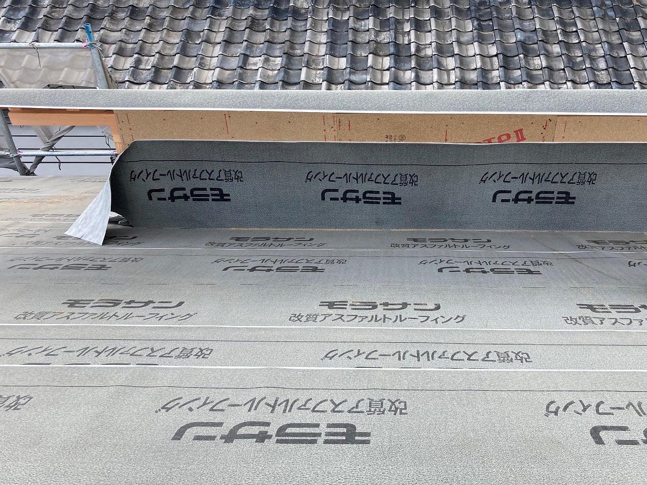 こちらが改質アスファルトルーフィングです。下葺き材は長期に渡って防水性を確保しなければなりません。屋根材表面の様な、直接雨風、紫外線にさらされることはありませんが、屋根材以上の耐久性は必要です。