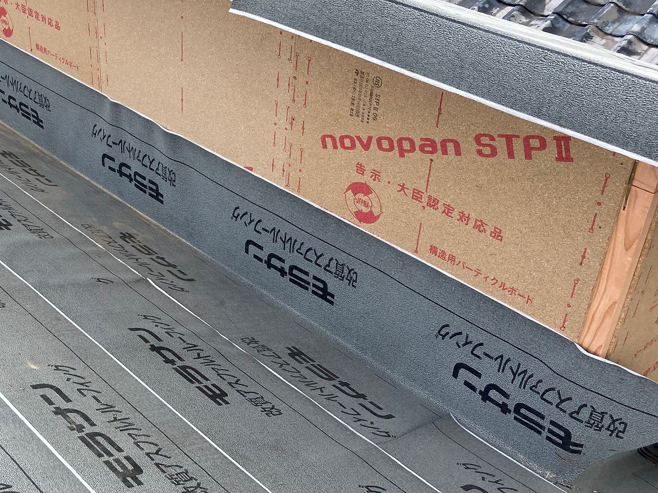 倉敷市中庄で増築工事中のお宅です。増築部の屋根材は最近多くなってきた、軽量で耐久性にも優れた板金屋根材です。大工さんの屋根下地が完了したので、下葺き材を張りました。下葺き材とは屋根材の下に敷く防水シートの事です。「ルーフィング」とも言い、アスファルト製が多い為「アスファルトルーフィング」とも言います。仕上がると目に見えない為、あまり重視されない傾向がありますが屋根材と同様に重要な部材です。万が一屋根材から雨水が浸入しても下の屋根下地、建物内部に雨水の侵入を防止してくれる役目をもっています。下葺き材には多くの種類が販売されています。今回使用した、ルーフィングは通常のアスファルトルーフィングよりさらに耐久性、信頼性の高い改質アスファルトルーフィングです。