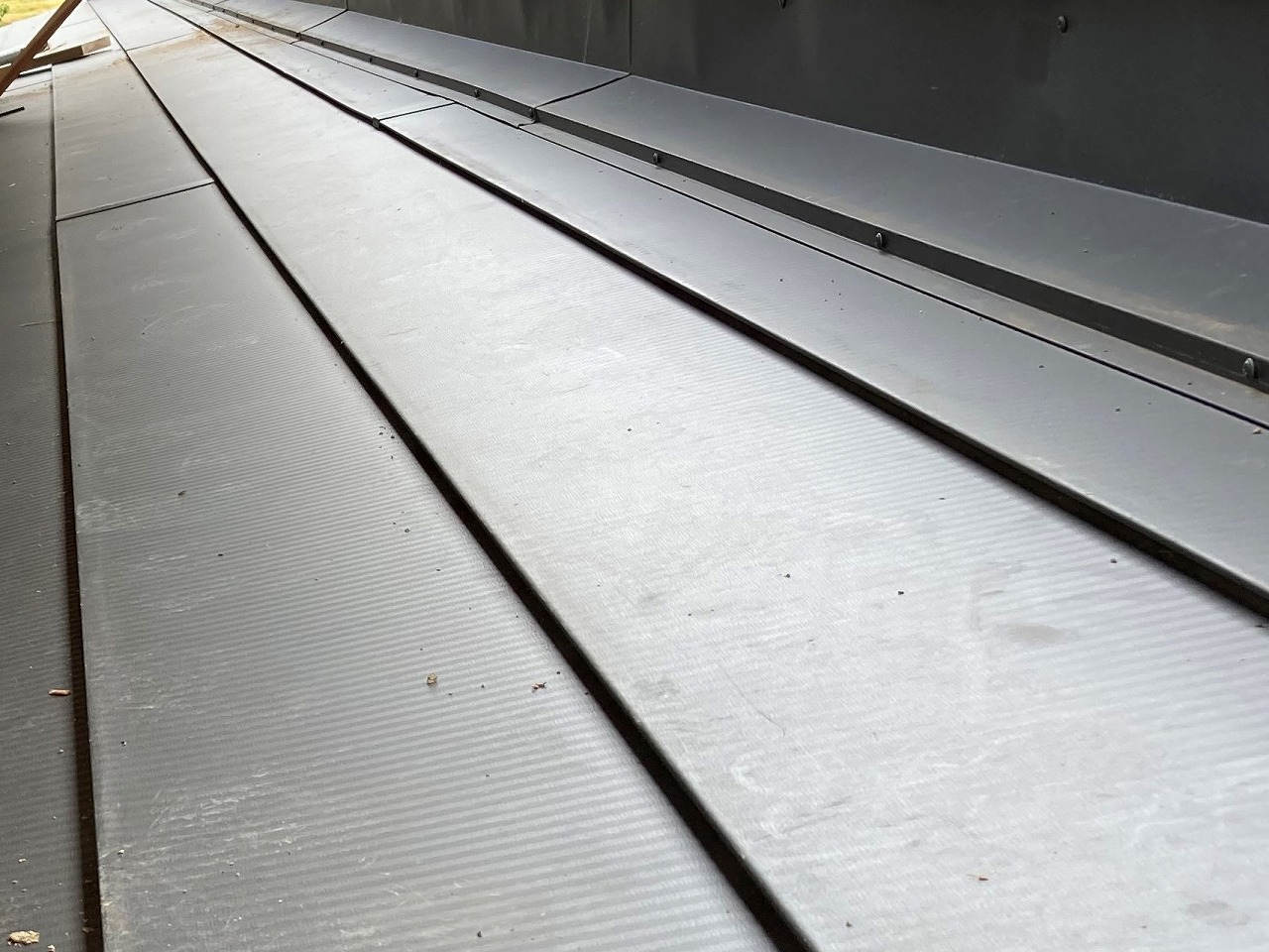 仕上げに使用する板金横葺き材です。屋根材の固定にもビスを使用します。高品質のルーフィングを使用することで貫通穴からの浸透に対しても有利になります。下葺き材にはさらに付加価値として表面にアルミ層を設けた遮熱ルーフィング、透湿機能を持った透湿防水シートなどもあります。せっかく耐久性の高い屋根材を使用しても低品質のルーフィングを使用したのでは意味がありません。街の屋根やさん岡山倉敷店では、ルーフィングにもこだわっています。見積時にも説明させていただき、付加価値のあるルーフィングの使用も可能です。永い安心と信頼の街の屋根やさん岡山倉敷店にご依頼ください。