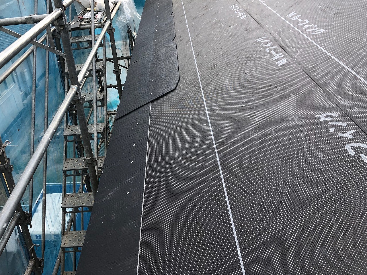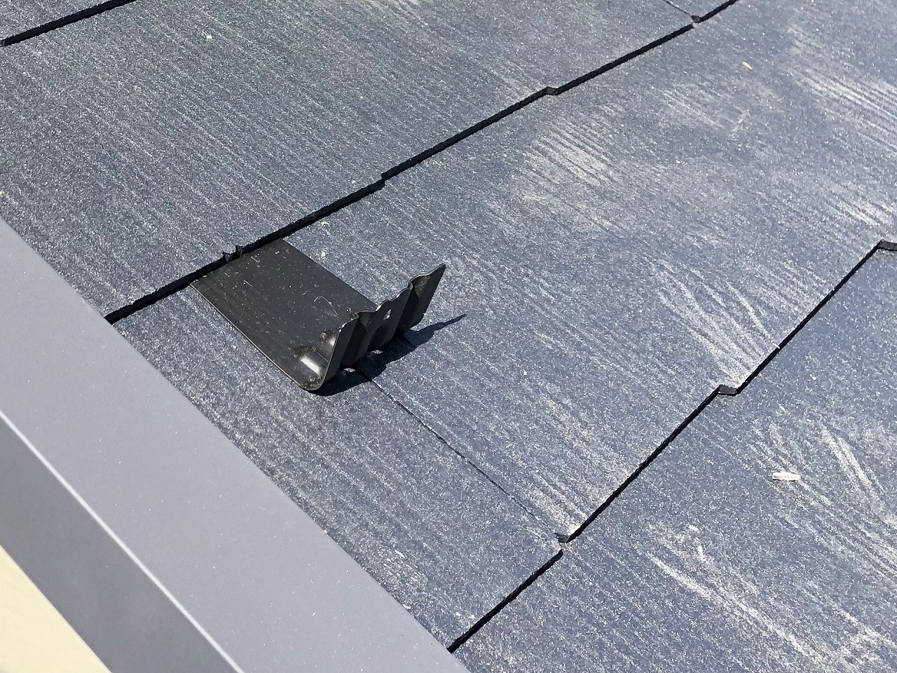 屋根葺きが完成するとこの様になります。屋根から露出するのはこの部分です。雪止め金物を取り付けたら絶対に雪が落ちないと言う事はありませんが、安心はできますね。