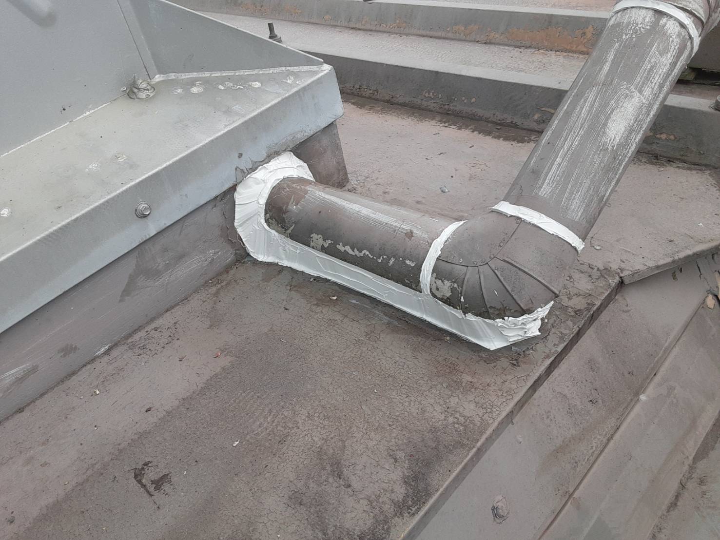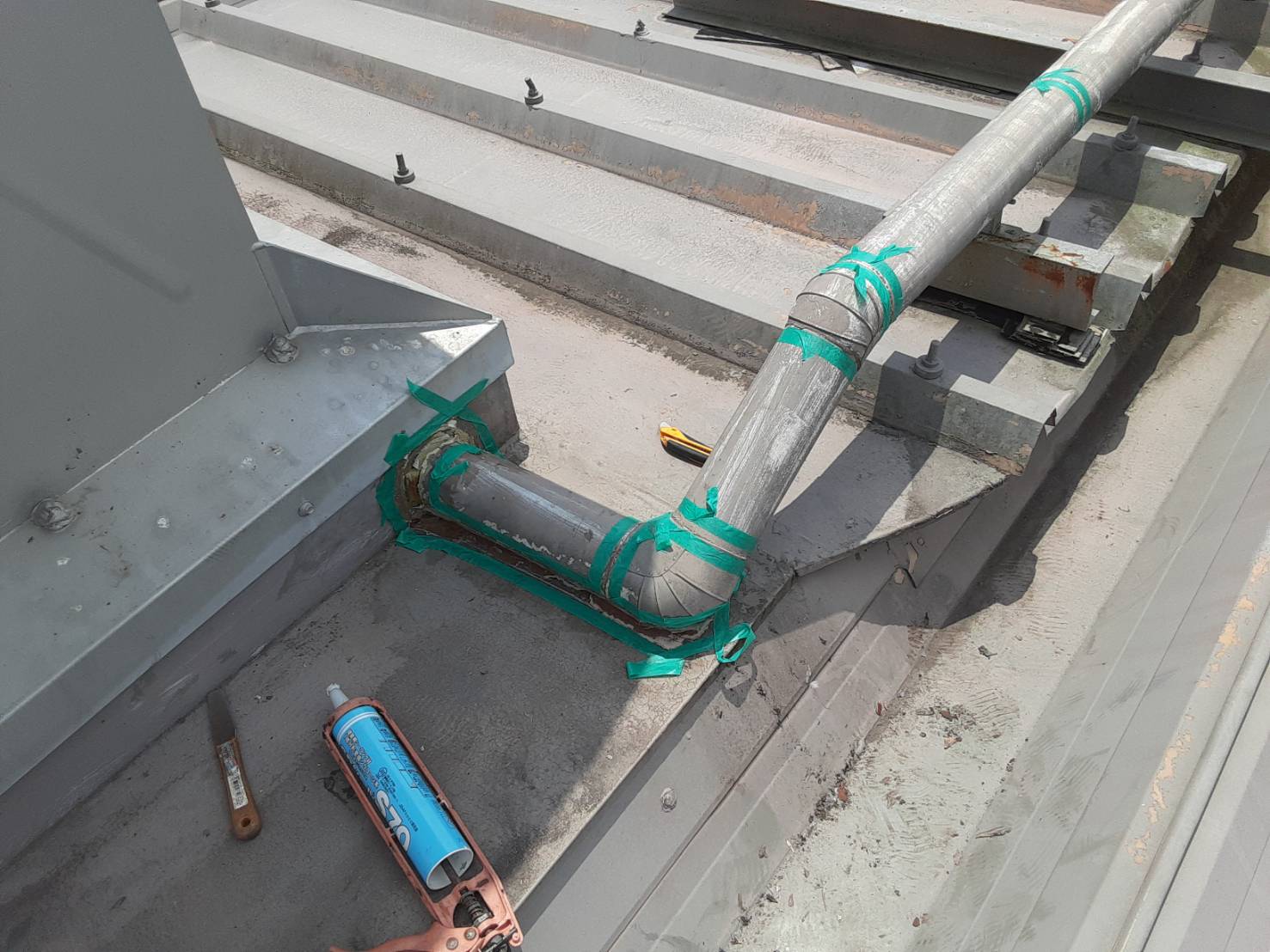折板屋根上の排気塔です。手前の塩ビパイプはエアコンの冷媒配管が入っています。排気塔の立ち上がり部は板金で仕舞されてますが、パイプ貫通部はシーリングで処理されています。また、パイプの勾配も内部に水が浸入する様になっています。