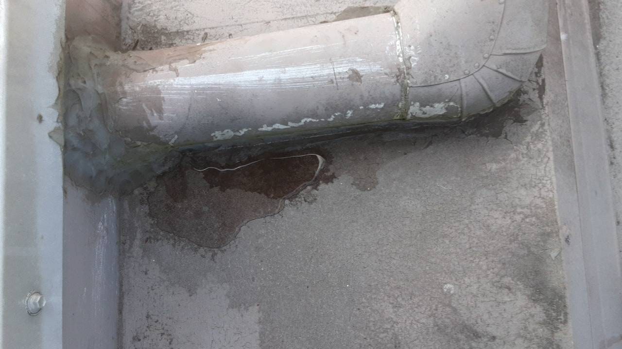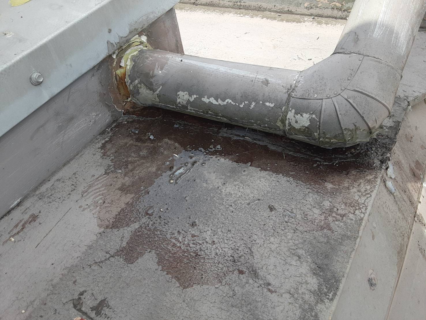 倉敷市水江で工場折板屋根からの雨漏り補修です。雨漏り箇所が排気塔周辺からと言う事で屋根上を確認したところ、エアコン冷媒配管が通った塩ビパイプ周辺から侵入している事を発見しました。排気塔側面との取り合い部分に水が溜まっています。開口部周辺のシーリングが剥離していました。今回、既存シーリング撤去後、シーリング再施工を行いました。
