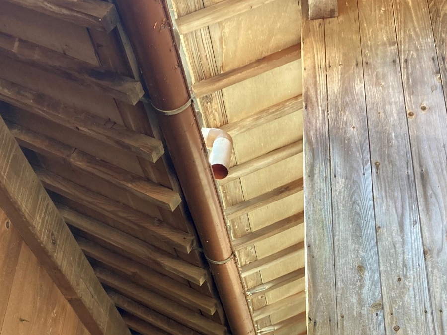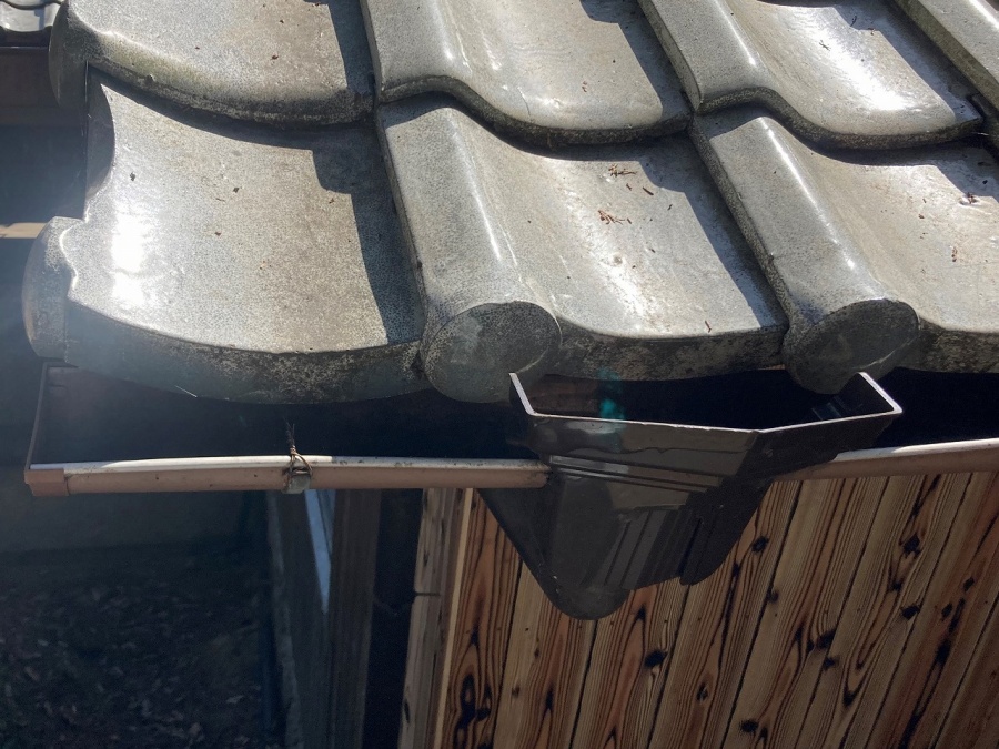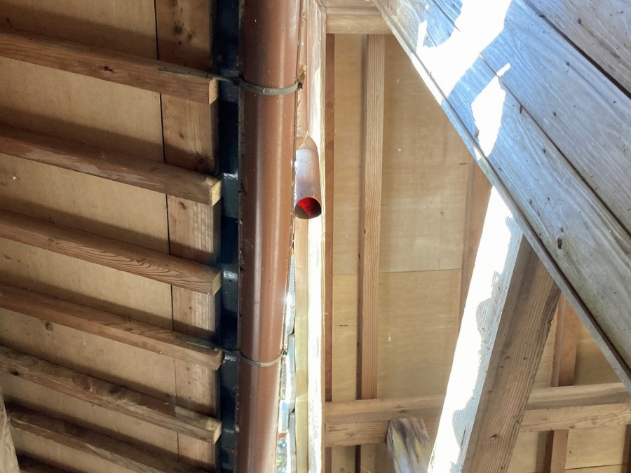軒先の部分を下から見ましたが、屋根上を伝っているハイ樋が手前に飛び出した状態でした。こちらのハイ樋はかなりの水量が流れます。正常な取付であっても半丸の容量では、まかないきれないでしょう。