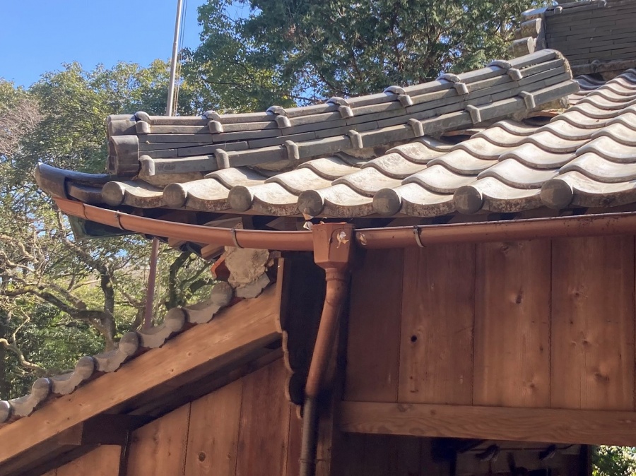 こちらはお寺などの日本家屋でよく見られる照り屋根です。屋根が反っています。こちらの部分の軒樋も当然反っています。樋も照り樋と言います。形状によく合っていますね。
