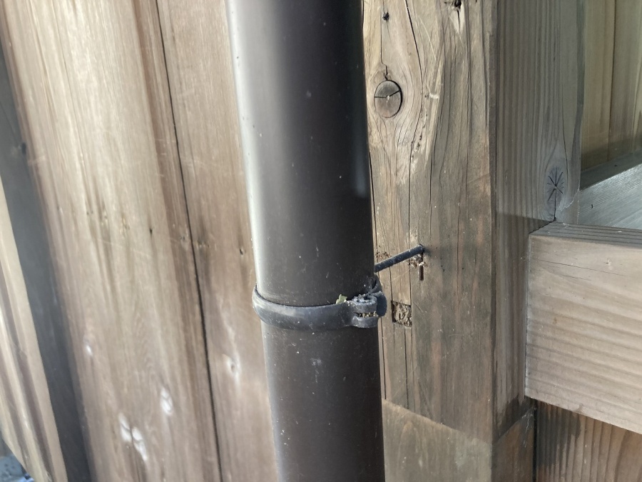 竪樋ですが、部分的に支持金物が打ち込みタイプなのですが、柱から抜けている部分がありました。外壁が天然木製ですので、モルタル、サイディングなどと比較したら水での劣化、変色の進行は早くなります。より注意が必要です。定期的な点検で、補修清掃を行うことで外壁を守ることが出来ます。少しでも不安に思うところがあるようでしたら点検のみでもお伺いさせていただきます。ご相談をお待ちしております。