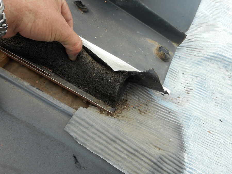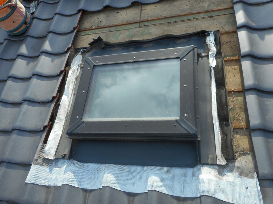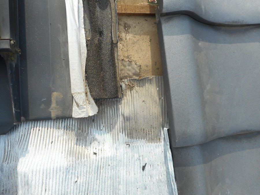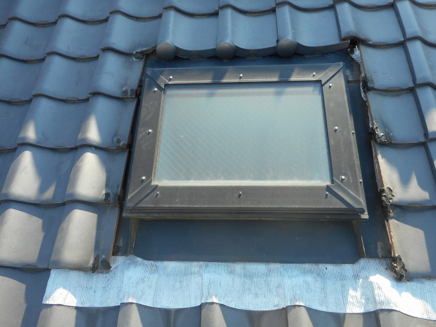 周辺の瓦を剥がした所です。トップライト周囲の板金、止水シール等が見えます。外部周辺部からの雨漏り原因として多くあるのは、周囲の排水部分が異物ゴミで詰まり、塞がってしまうことにより流れた雨水が板金部を超えて屋根裏に漏れることがあります。こちらでは、排水部分の異物ゴミはありませんでした。また、目視ですが、板金水切りの損傷穴あきも無いようです。ただ、止水シールは経年劣化も気になるので交換したいですね。